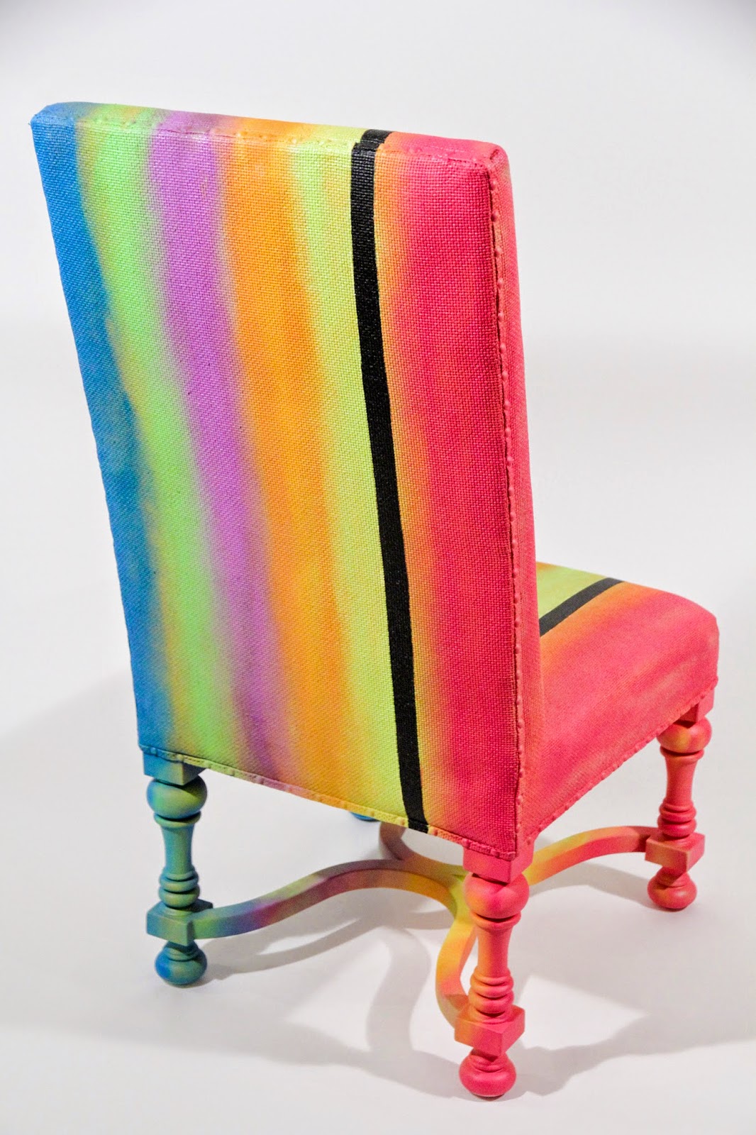 Defining Line--This Berhardt chair was primed in Benjamin Moore White and then hand-painted using artist spray paints from the Germany company Montana transforming the ordinary into a colorful and bold piece of art. Cramer's inspiration is bold color. Life is too short to be boring and why not liven up a space up with a healthy shot of bold, vibrant color. The chair now stands on its own as a powerful work of art.